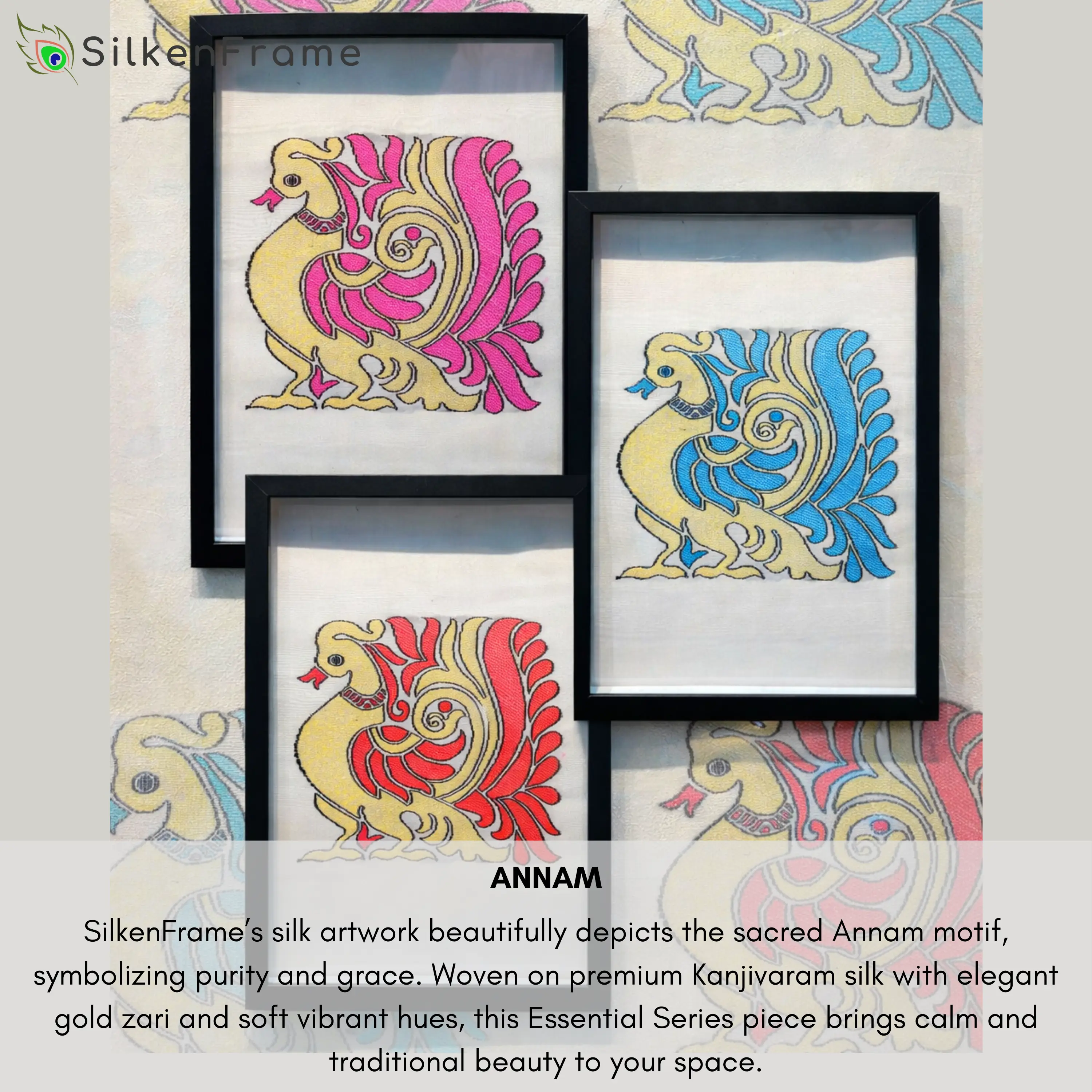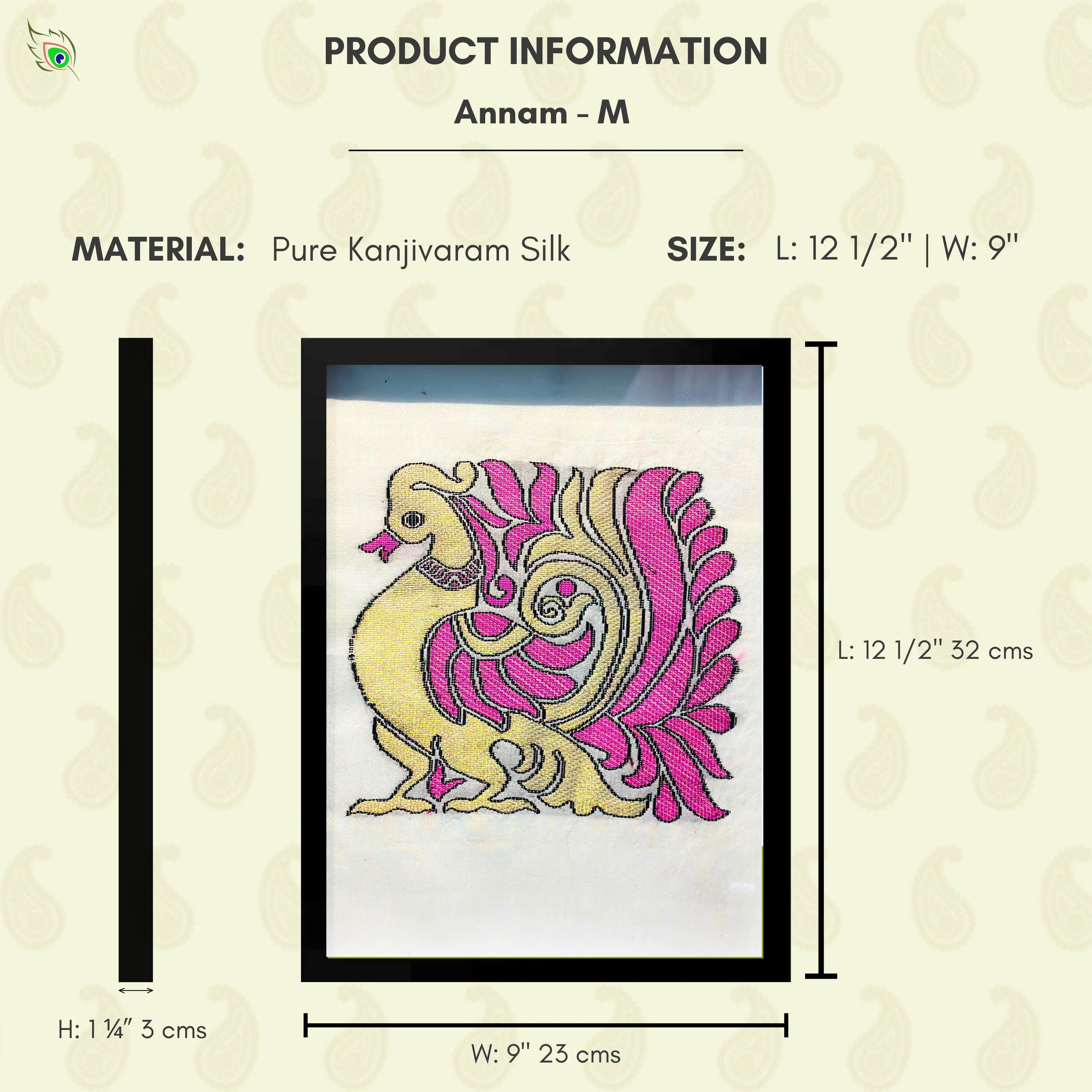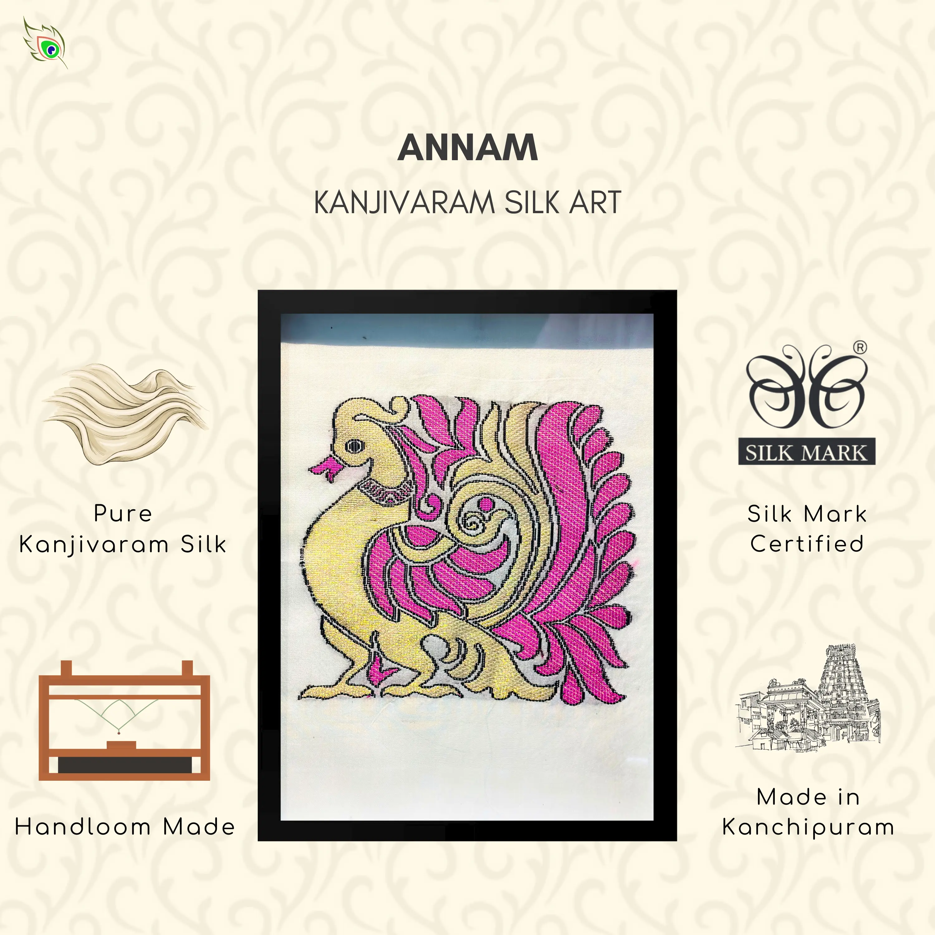 As a Silk Mark Organisation of India member, SilkenFrame guarantees that each artwork is crafted from pure natural silk and carries the official Silk Mark hologram issued by the Central Silk Board, Government of India. All SilkenFrame Artworks are Handloom made in Kanchipuram, Tamil Nadu. Buy Kanjivaram Silk Art – Handcrafted Wall Frame of Annam by SilkenFrame SilkenFrame presents Annam, a graceful handloom-woven Kanjivaram silk artwork inspired by the sacred swan motif, symbolizing purity, wisdom, and divine beauty in Indian tradition. This elegant design reflects simplicity and cultural depth, making it a timeless expression of heritage art. Woven on authentic Kanjivaram silk from Kanchipuram, the artwork features delicate detailing enhanced with gold zari and soft yet vibrant shades of red, pink, and green, beautifully balanced on a serene half-white base. The flowing form of the Annam and the refined color palette create a harmonious visual appeal rooted in tradition. Ideal for pooja rooms, living spaces, or thoughtful gifting, this artwork from SilkenFrame’s Essential Series brings a sense of calm, auspiciousness, and artistic elegance into your home. Made with: Pure Kanjivaram Silk and Gold Zari Base Color: Half White Design Colors: Gold Zari, Red / Pink / Green, and Dark BrownAnnam | Pure Kanjivaram Silk Art | Handloom | Essential Series