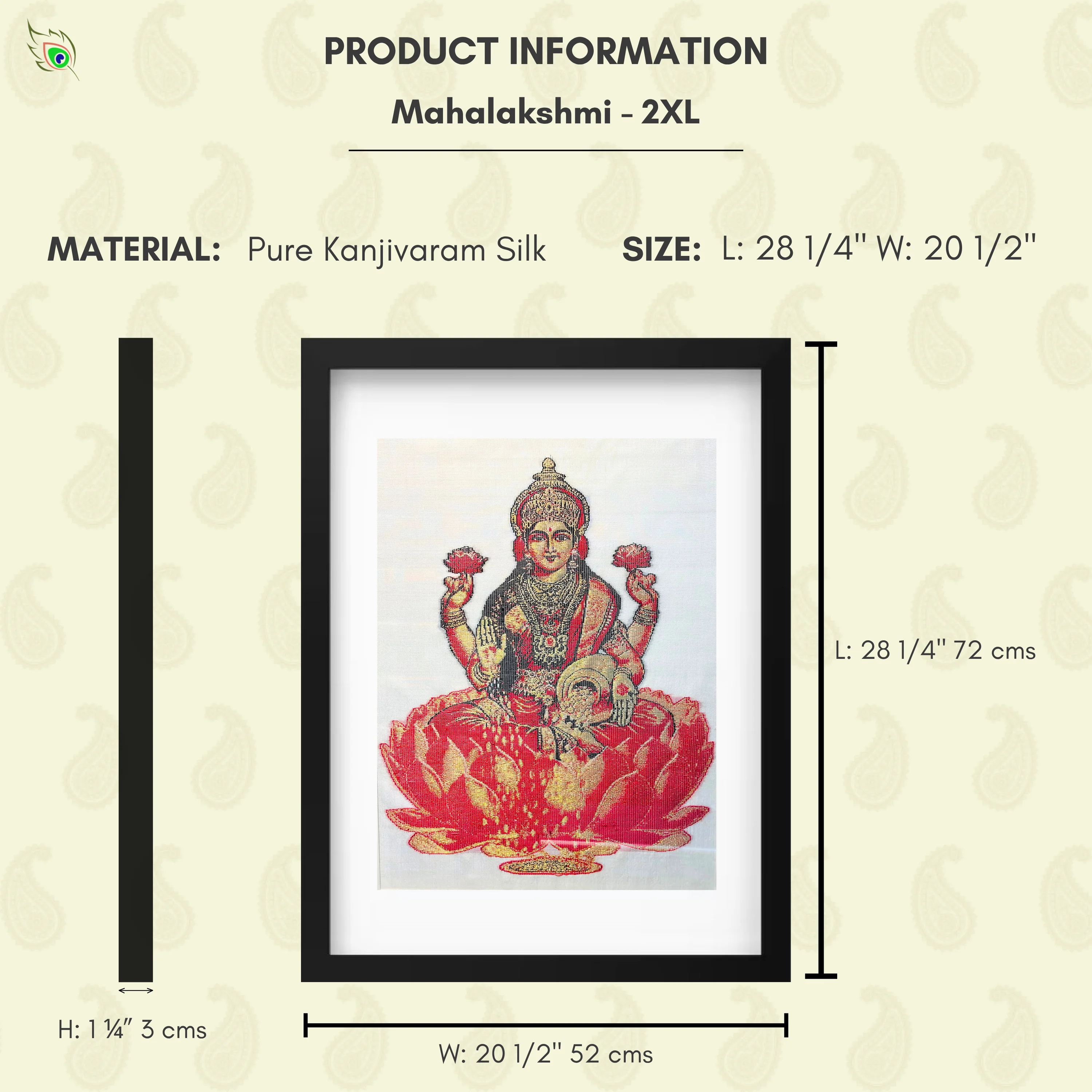As a Silk Mark Organisation of India member, SilkenFrame guarantees that each artwork is crafted from pure natural silk and carries the official Silk Mark hologram issued by the Central Silk Board, Government of India. All SilkenFrame Artworks are Handloom made in Kanchipuram, Tamil Nadu. Buy Kanjivaram Silk Art – Handcrafted Wall Frame of Goddess Mahalakshmi by SilkenFrame SilkenFrame proudly presents a handcrafted silk art of Goddess Lakshmi, a radiant symbol of prosperity, abundance, and divine grace. This exquisite artwork portrays Goddess Mahalakshmi in her serene and luminous form, holding the symbolic lotus and coins that bestow wealth, wisdom, and spiritual well-being. Woven with care on authentic Kanjivaram silk from Kanchipuram, Tamil Nadu, this masterpiece reflects the heritage of South Indian handloom tradition. The use of pure silk, fine zari accents, and detailed craftsmanship by skilled artisans makes this more than just décor—it’s sacred art infused with cultural soul. Perfect for your home temple, meditation space, or living area, this Goddess Lakshmi wall art invites positive energy and divine blessings into your surroundings. Buy Kanjivaram Silk Art of Goddess Mahalakshmi or shop Goddess Lakshmi wall frame in India with SilkenFrame to bring timeless spiritual elegance and Indian craftsmanship into your home. Made with Pure Kanjivaram Silk and Gold Zari Colors:- Base: Half White, Design: Gold Zari, Red and Dark BrownGoddess Mahalakshmi | Pure Kanjivaram Silk Art | Handloom