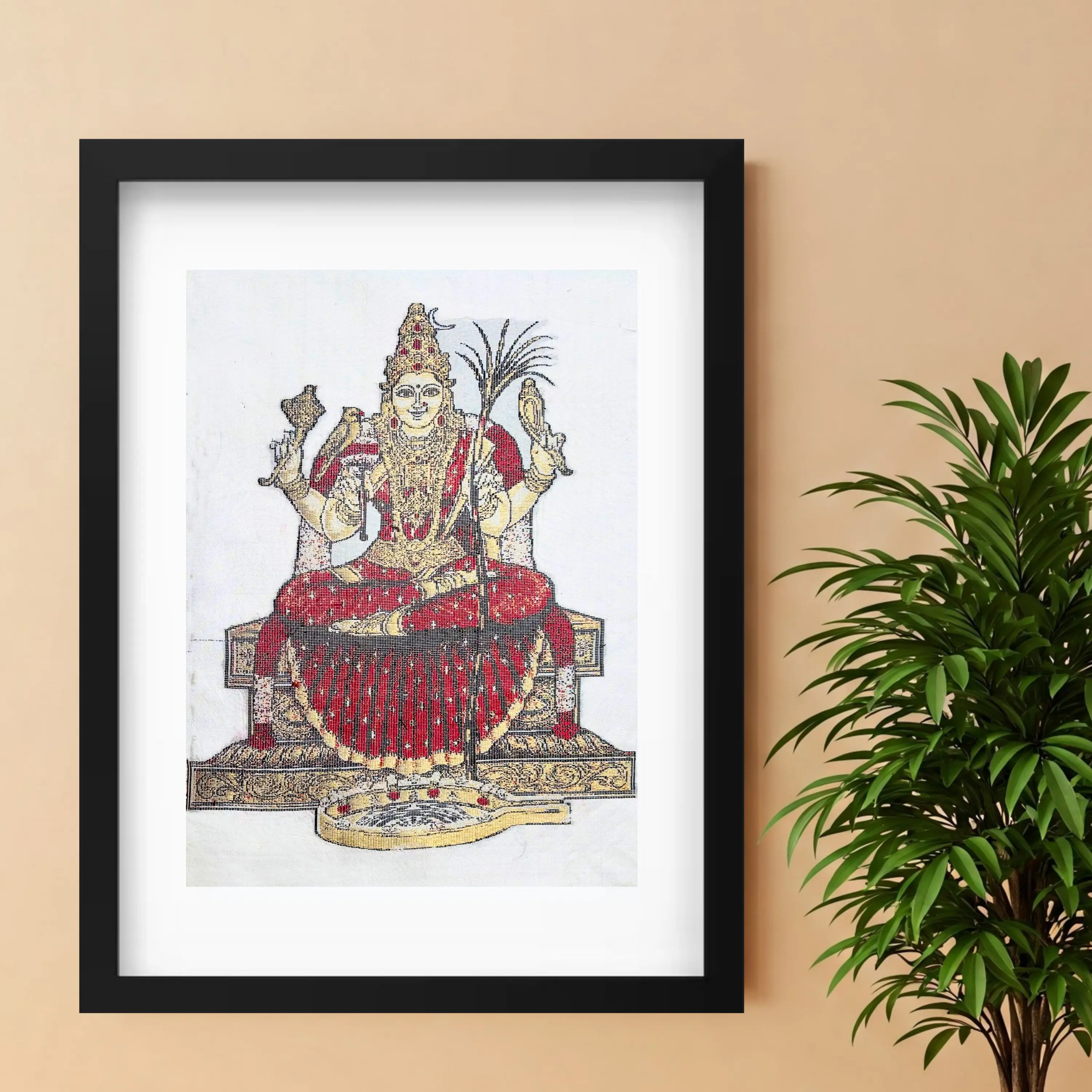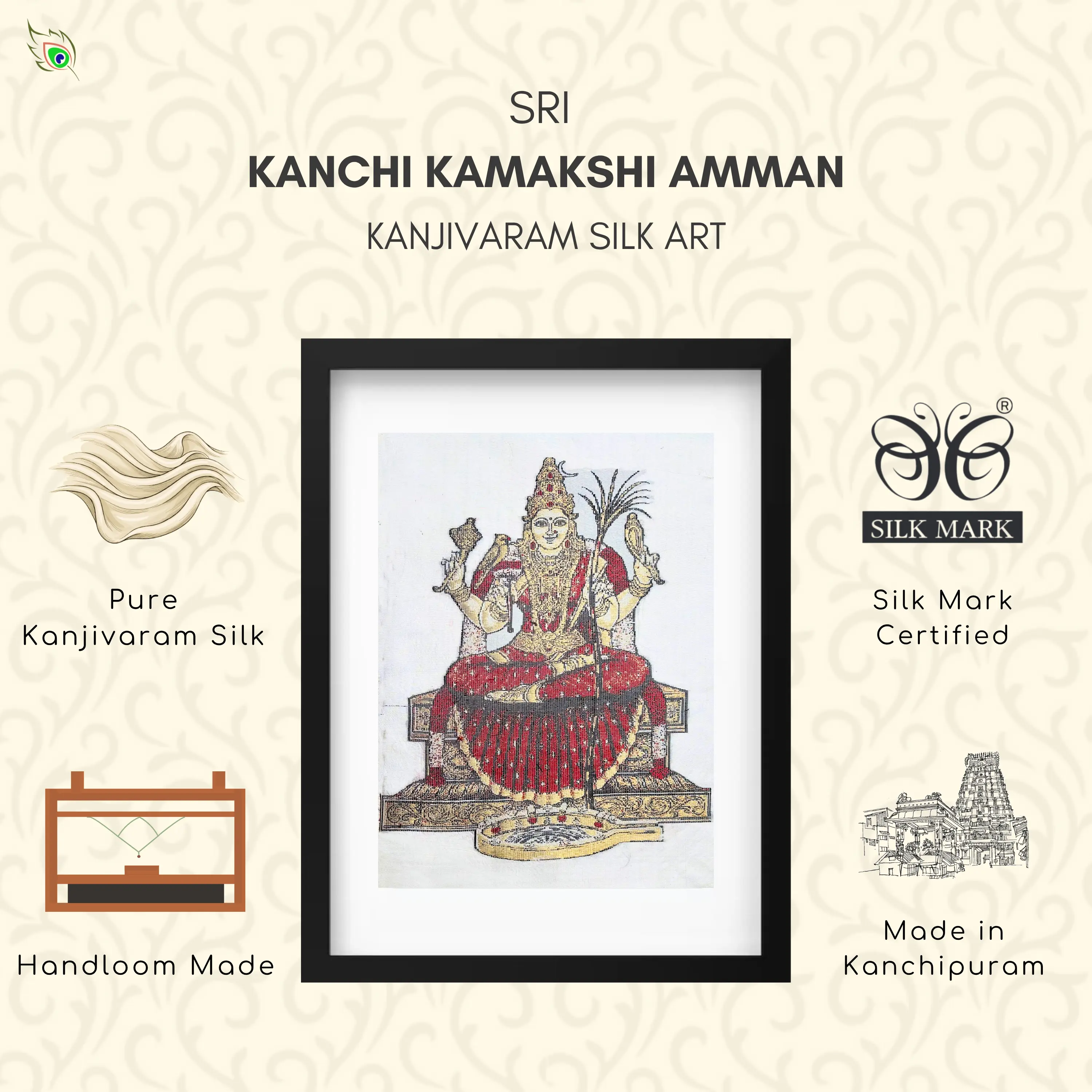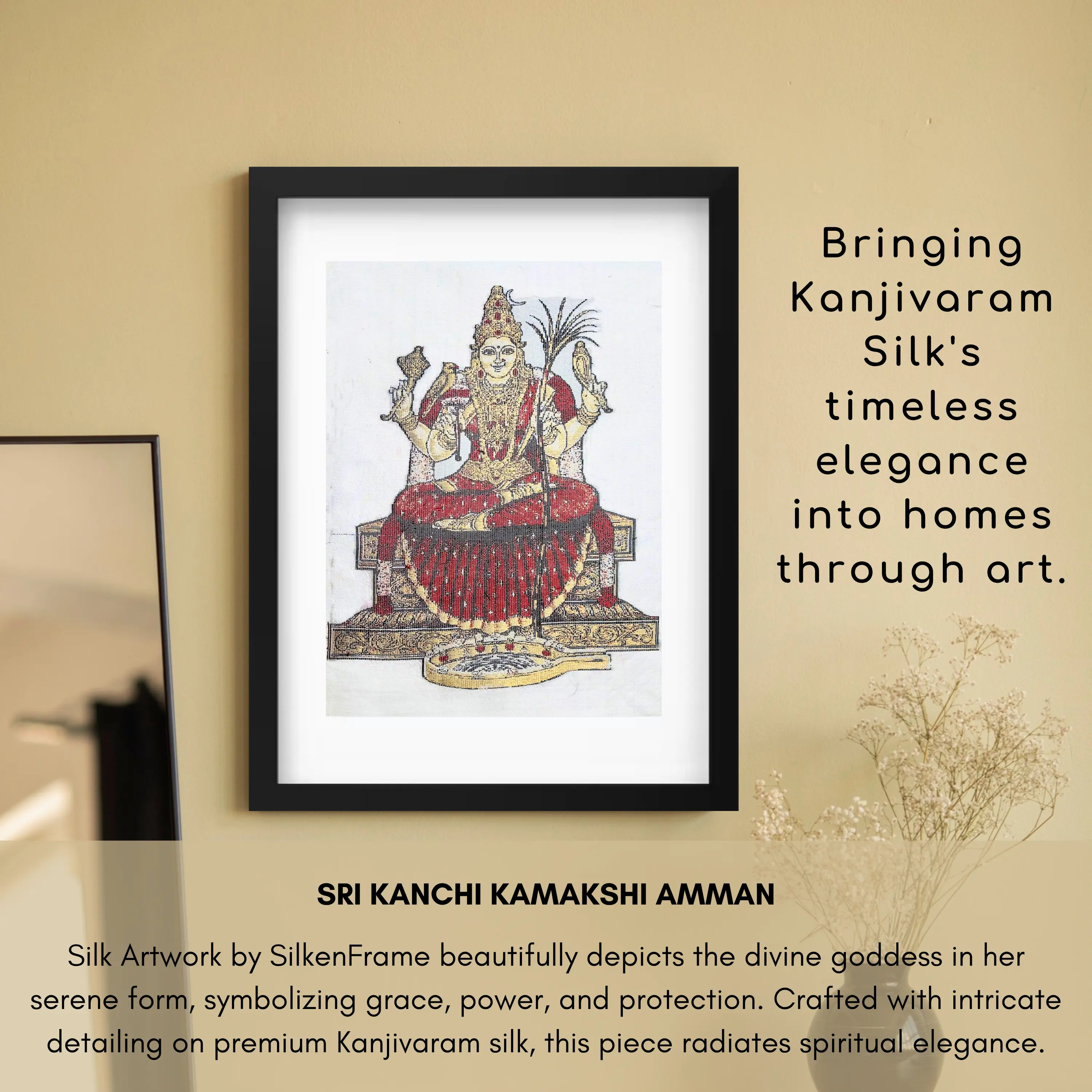 As a Silk Mark Organisation of India member, SilkenFrame guarantees that each artwork is crafted from pure natural silk and carries the official Silk Mark hologram issued by the Central Silk Board, Government of India. All SilkenFrame Artworks are Handloom made in Kanchipuram, Tamil Nadu. Divine Kamakshi Amman – Handcrafted Kanjivaram Silk Artwork by SilkenFrame Buy Online Kamakshi Amman Framed Decor that radiates divine grace, spiritual strength, and timeless beauty with this exquisite silk artwork by SilkenFrame. Portrayed in her serene yet powerful form, Goddess Kamakshi Amman is brought to life through intricate detailing and symbolic elegance on authentic Kanjivaram silk. Woven in Kanchipuram, Tamil Nadu, using traditional handloom methods, this masterpiece features GI-tagged silk, vibrant colors, and shimmering gold zari work—ensuring both authenticity and heritage value. Each element reflects the spiritual energy and cultural depth associated with Kamakshi Amman, a revered form of the divine feminine in Hindu tradition. This handcrafted Kamakshi Amman artwork from India is ideal for adorning puja rooms, meditation spaces, or heritage-inspired interiors. It serves not only as sacred wall decor but also as a celebration of Indian textile art and spiritual devotion. Honor tradition and elevate your space—shop SilkenFrame's Kamakshi Amman silk art for a truly divine presence in every thread. Made with Pure Kanjivaram Silk and Gold Zari Colors:- Base: Half White, Design: Gold Zari, Pink and Dark BrownKamakshi Amman | Pure Kanjivaram Silk Art | Handloom