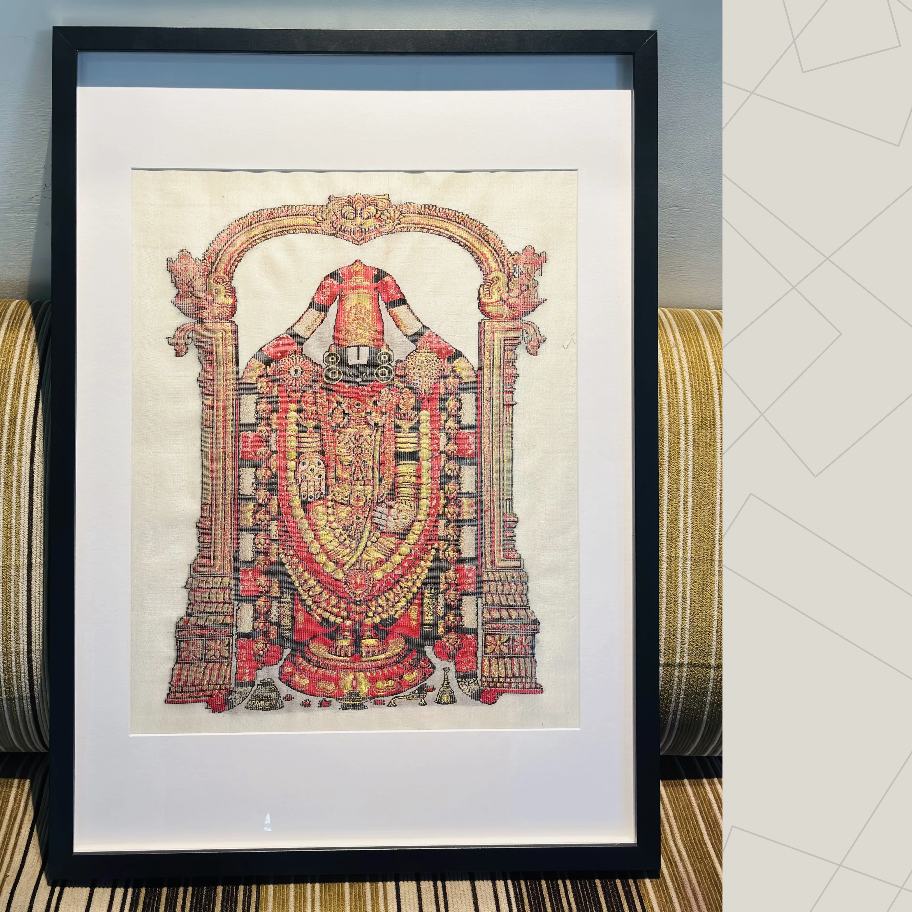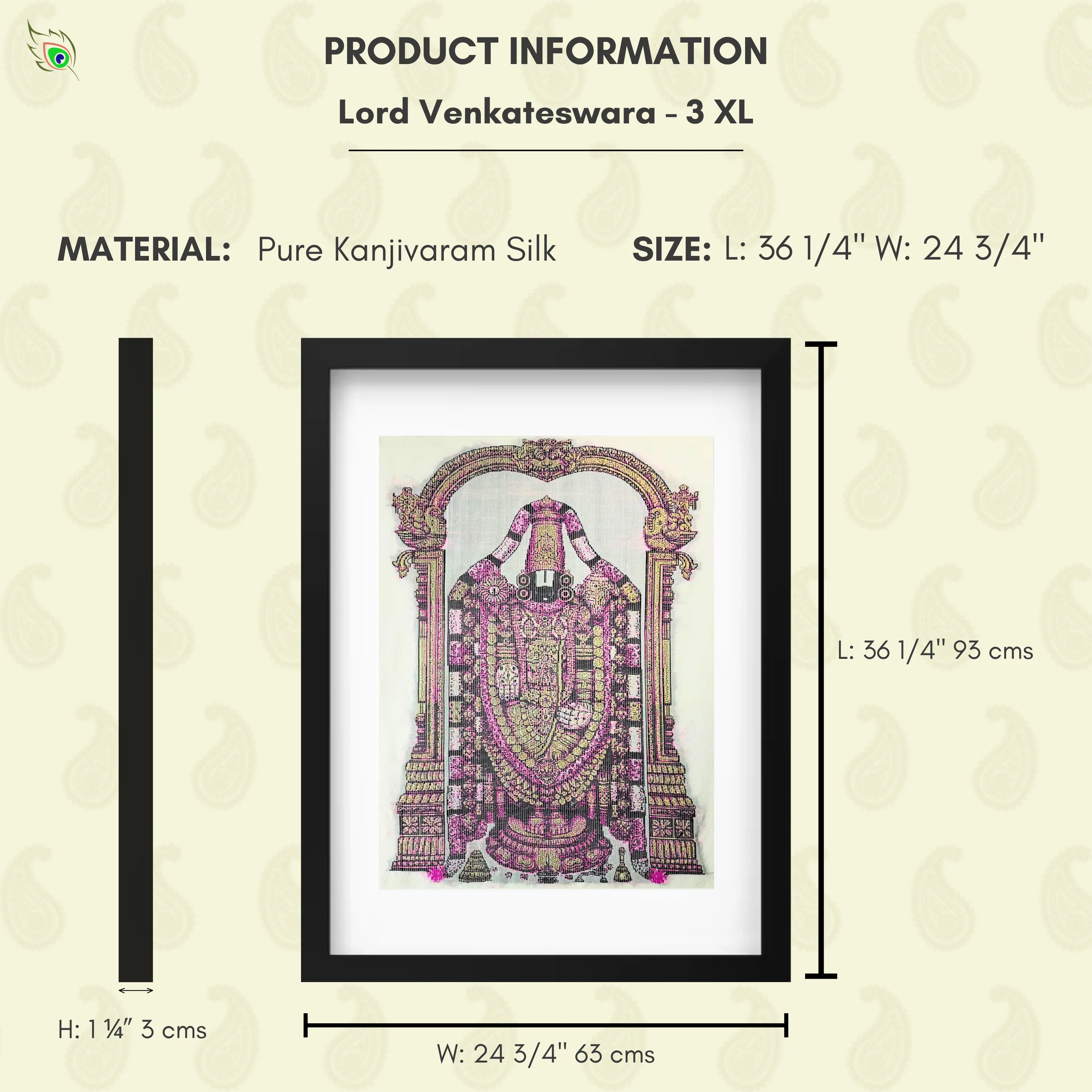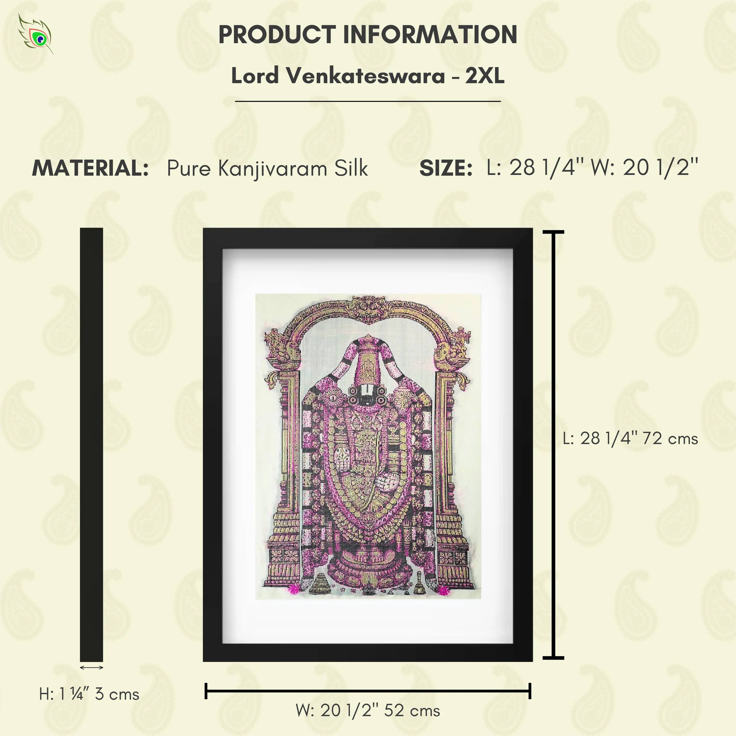 As a Silk Mark Organisation of India member, SilkenFrame guarantees that each artwork is crafted from pure natural silk and carries the official Silk Mark hologram issued by the Central Silk Board, Government of India. All SilkenFrame Artworks are Handloom made in Kanchipuram, Tamil Nadu. Experience the Divine Grace of Lord Venkateswara with Exquisite Silk Wall Art Bring home the divine energy of Lord Venkateswara Silk Wall Art – Buy Online at SilkenFrame, where tradition meets timeless artistry. This handcrafted masterpiece captures the sacred presence of Lord Venkateswara, revered for his strength, compassion, and eternal protection. Woven on pure Kanjivaram silk and adorned with intricate gold zari detailing, it radiates spiritual elegance and divine majesty. Each piece is a result of meticulous craftsmanship, handwoven in Kanchipuram, Tamil Nadu — the heart of India’s legendary silk weaving tradition. This Handmade Venkateswara Wall Hanging in India is more than just decor; it is a spiritual centerpiece that embodies heritage and devotion. Buy Venkateswara Framed Decor in India to elevate your space with temple-inspired art, framed to perfection for your home, office, or prayer room. Whether as a thoughtful gift or a personal expression of faith, this silk artwork brings the sacred aura of Tirupati into contemporary living spaces. Celebrate the spirit of devotion, heritage, and Indian craftsmanship — only at SilkenFrame. Made with Pure Kanjivaram Silk and Gold Zari Colors:- Base: Half White, Design: Gold Zari, Pink and Dark BrownLord Venkateswara | Pure Kanjivaram Silk Art | Handloom