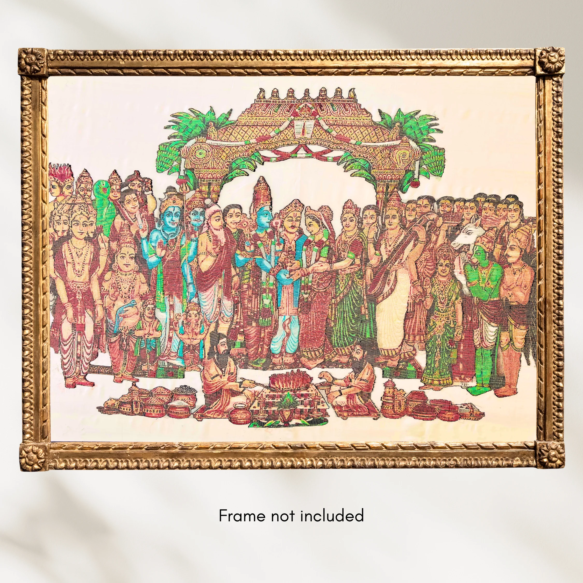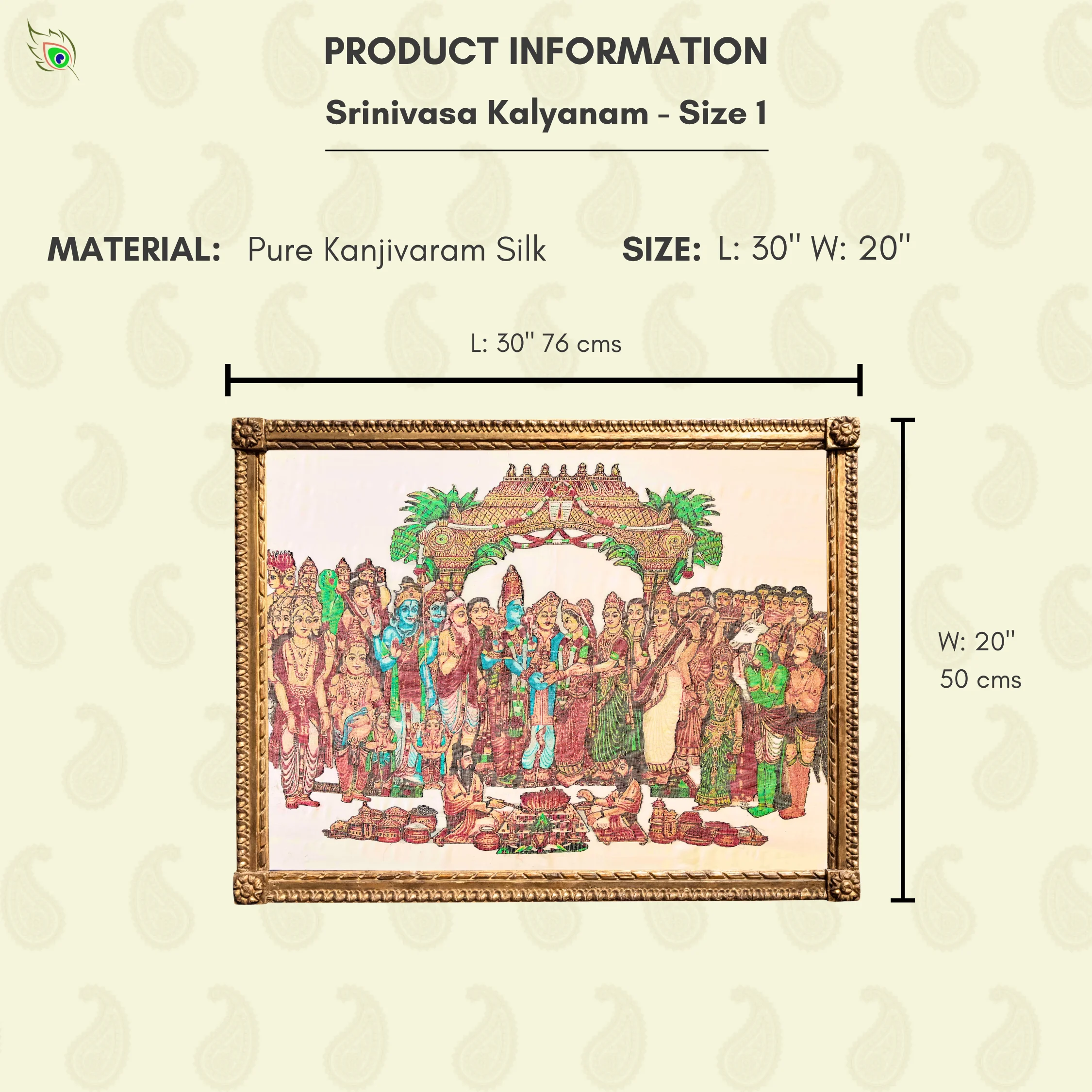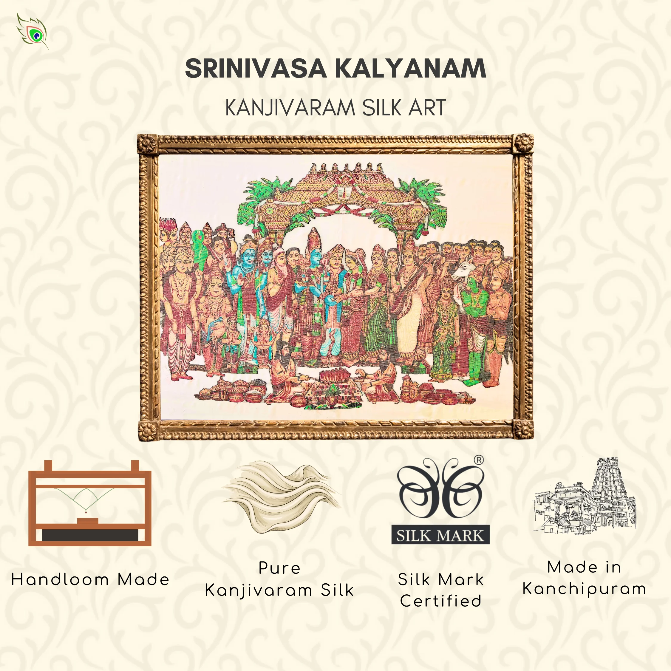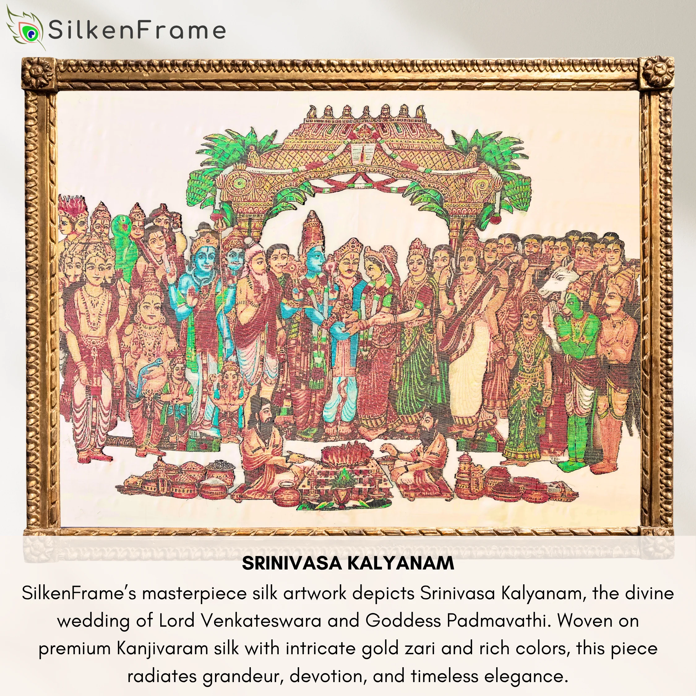 As a Silk Mark Organisation of India member, SilkenFrame guarantees that each artwork is crafted from pure natural silk and carries the official Silk Mark hologram issued by the Central Silk Board, Government of India. All SilkenFrame Artworks are Handloom made in Kanchipuram, Tamil Nadu. Buy Kanjivaram Silk Art – Handcrafted Wall Frame of Srinivasa Kalyanam by SilkenFrame SilkenFrame presents Srinivasa Kalyanam, a grand handloom-woven Kanjivaram silk artwork that beautifully captures the divine celestial wedding of Lord Venkateswara (Srinivasa) and Goddess Padmavathi — a sacred union symbolizing prosperity, harmony, and eternal auspiciousness. This masterpiece intricately portrays the divine couple amidst a richly detailed ceremonial setting, reflecting the magnificence of traditional South Indian temple celebrations. Every element—from the ornate attire and sacred ornaments to the divine expressions—is brought to life with exceptional artistry and devotion. Woven on authentic Kanjivaram silk from Kanchipuram, this artwork features luxurious detailing with gold zari, enhanced by a vibrant palette of red, green, and Ramar blue, along with deep dark brown tones on a serene half-white base. The richness of colors and complexity of the composition elevate this piece into a true collector’s artwork within SilkenFrame’s Masterpiece Series. Ideal as a statement piece for grand interiors, pooja spaces, or heirloom gifting, this silk artwork embodies divine celebration, cultural richness, and timeless craftsmanship, making it a treasured symbol of tradition and devotion. Made with: Pure Kanjivaram Silk and Gold Zari Base Color: Half White Design Colors: Gold Zari, Red, Green, Ramar Blue, and Dark BrownSrinivasa Kalyanam | Pure Kanjivaram Silk Art | Handloom | Masterpiece Series