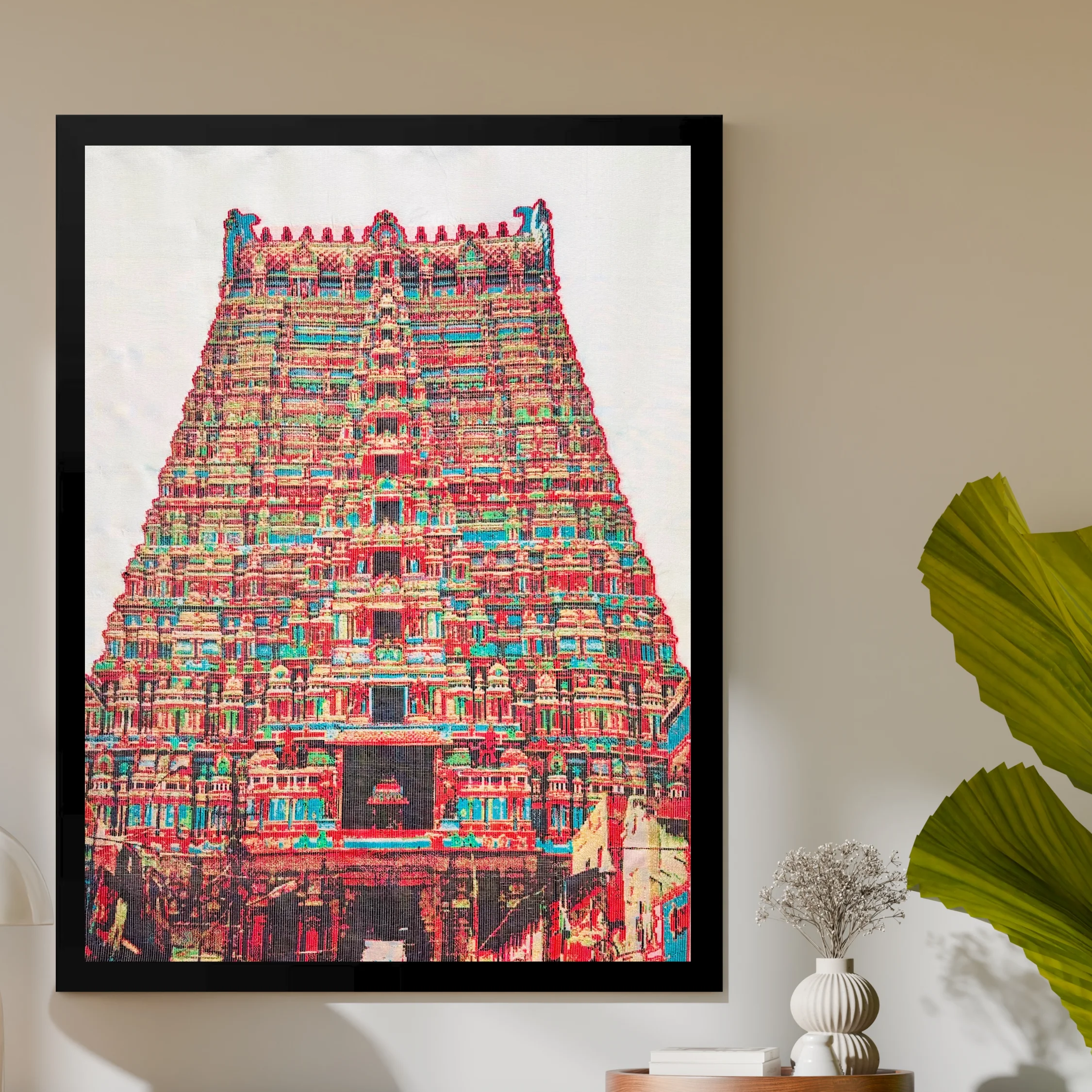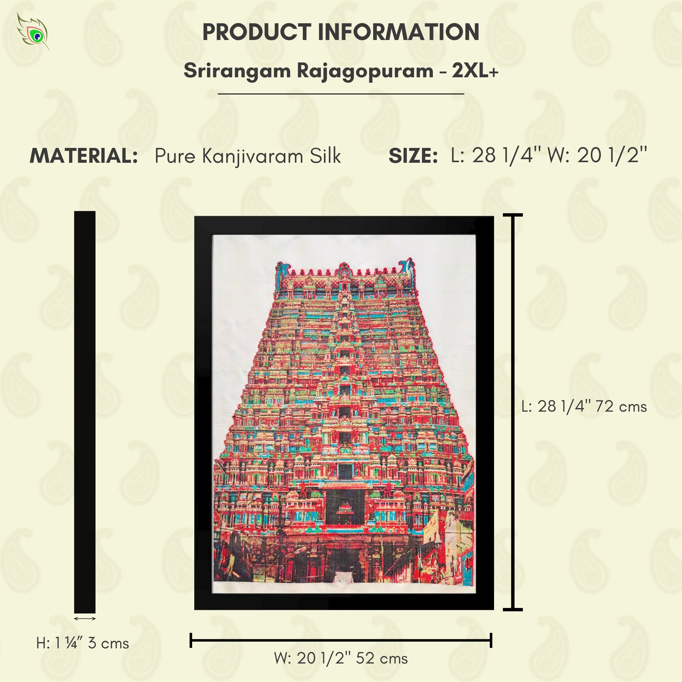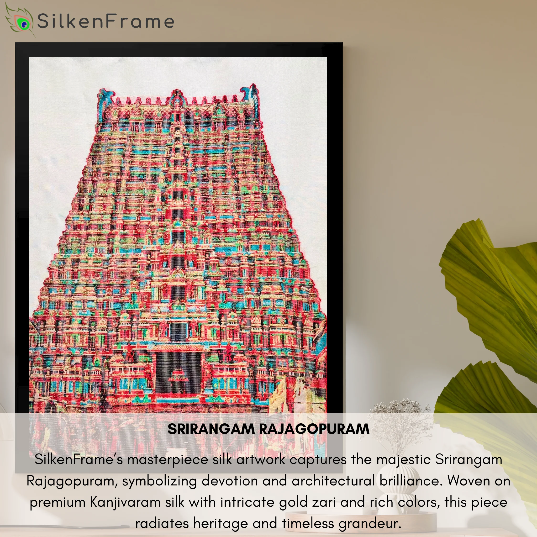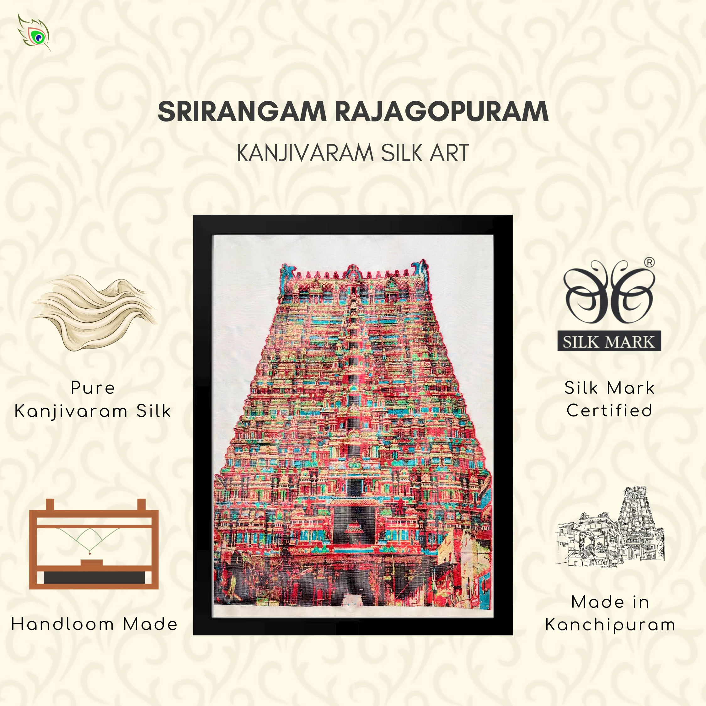 As a Silk Mark Organisation of India member, SilkenFrame guarantees that each artwork is crafted from pure natural silk and carries the official Silk Mark hologram issued by the Central Silk Board, Government of India. All SilkenFrame Artworks are Handloom made in Kanchipuram, Tamil Nadu. Buy Kanjivaram Silk Art – Handcrafted Wall Frame of Srirangam Rajagopuram by SilkenFrame SilkenFrame presents Srirangam Rajagopuram, a magnificent handloom-woven Kanjivaram silk artwork that captures the iconic grandeur of the Rajagopuram of the Sri Ranganathaswamy Temple, one of the tallest and most revered temple towers in India. This masterpiece reflects the architectural brilliance and spiritual legacy of South Indian temple tradition. Intricately woven with remarkable precision, the artwork showcases the towering gopuram adorned with layered sculptures, sacred motifs, and ornamental detailing, bringing alive the majesty of temple architecture. Each element is rendered with devotion, celebrating the harmony between art, faith, and heritage. Crafted on authentic Kanjivaram silk from Kanchipuram, this piece features rich detailing with gold zari, complemented by vibrant hues of red, green, and Ramar blue, along with deep dark brown tones on a serene half-white base. The interplay of colors and intricate weaving elevates this artwork into a true collector’s piece within SilkenFrame’s Masterpiece Series. Ideal for grand interiors, spiritual spaces, or as a heritage statement piece, this silk artwork embodies devotion, architectural splendor, and timeless craftsmanship, making it a striking addition to any setting. Made with: Pure Kanjivaram Silk and Gold Zari Base Color: Half White Design Colors: Gold Zari, Red, Green, Ramar Blue, and Dark BrownSrirangam Rajagopuram | Pure Kanjivaram Silk Art | Handloom | Masterpiece Series