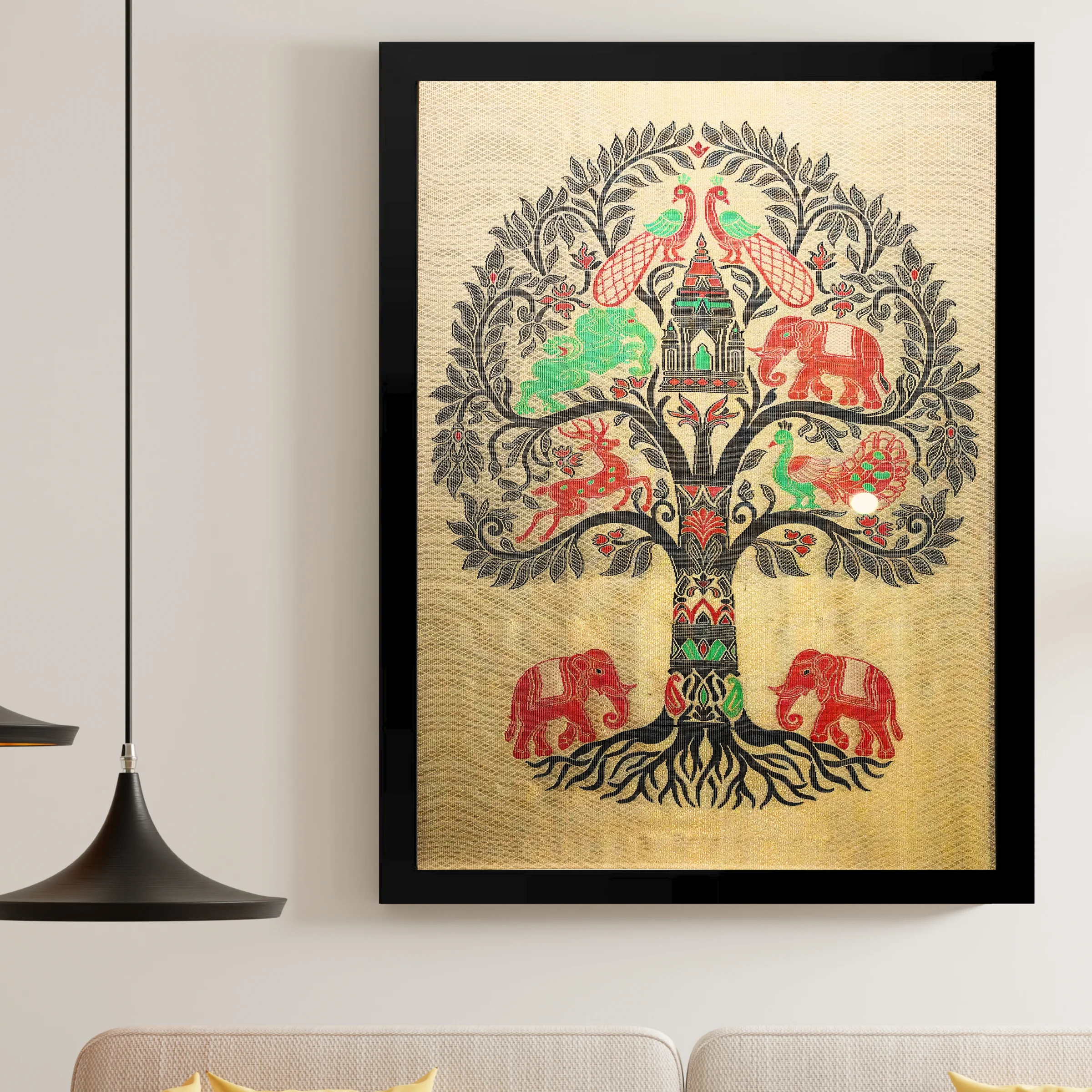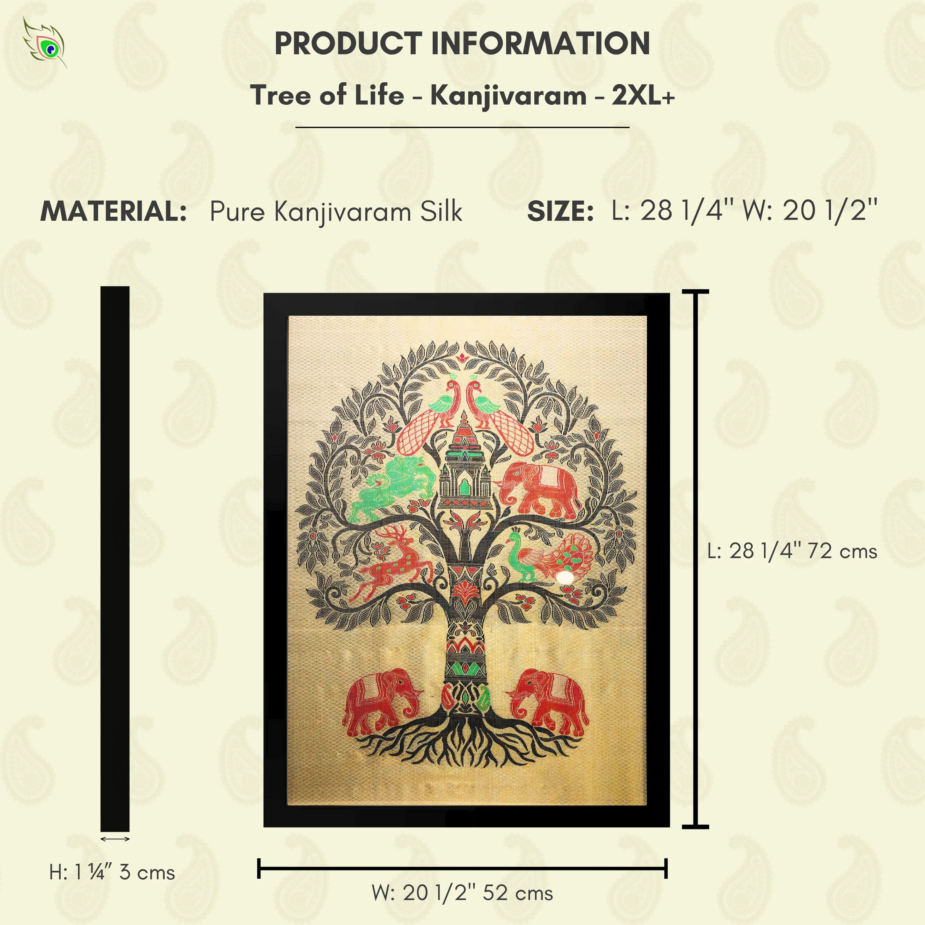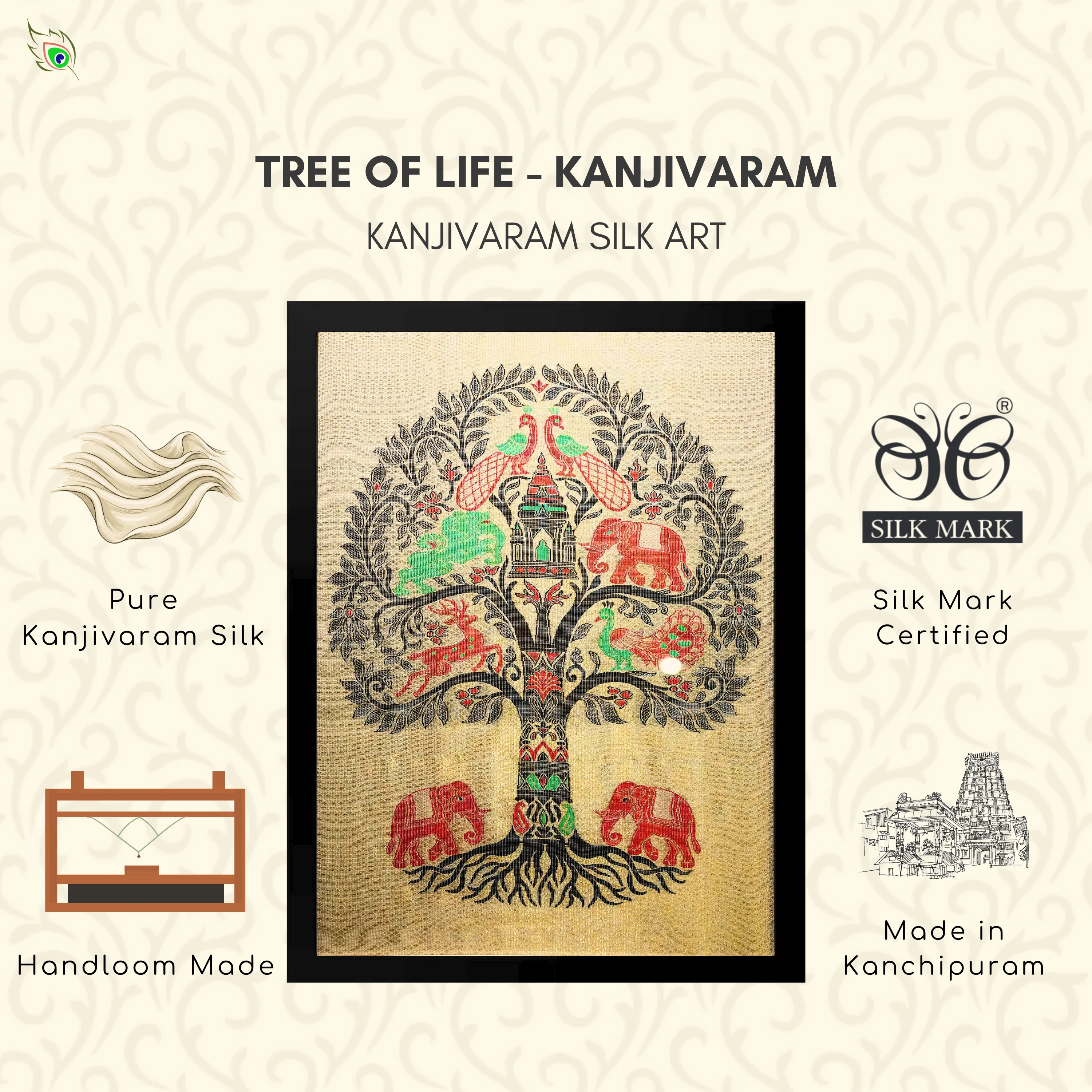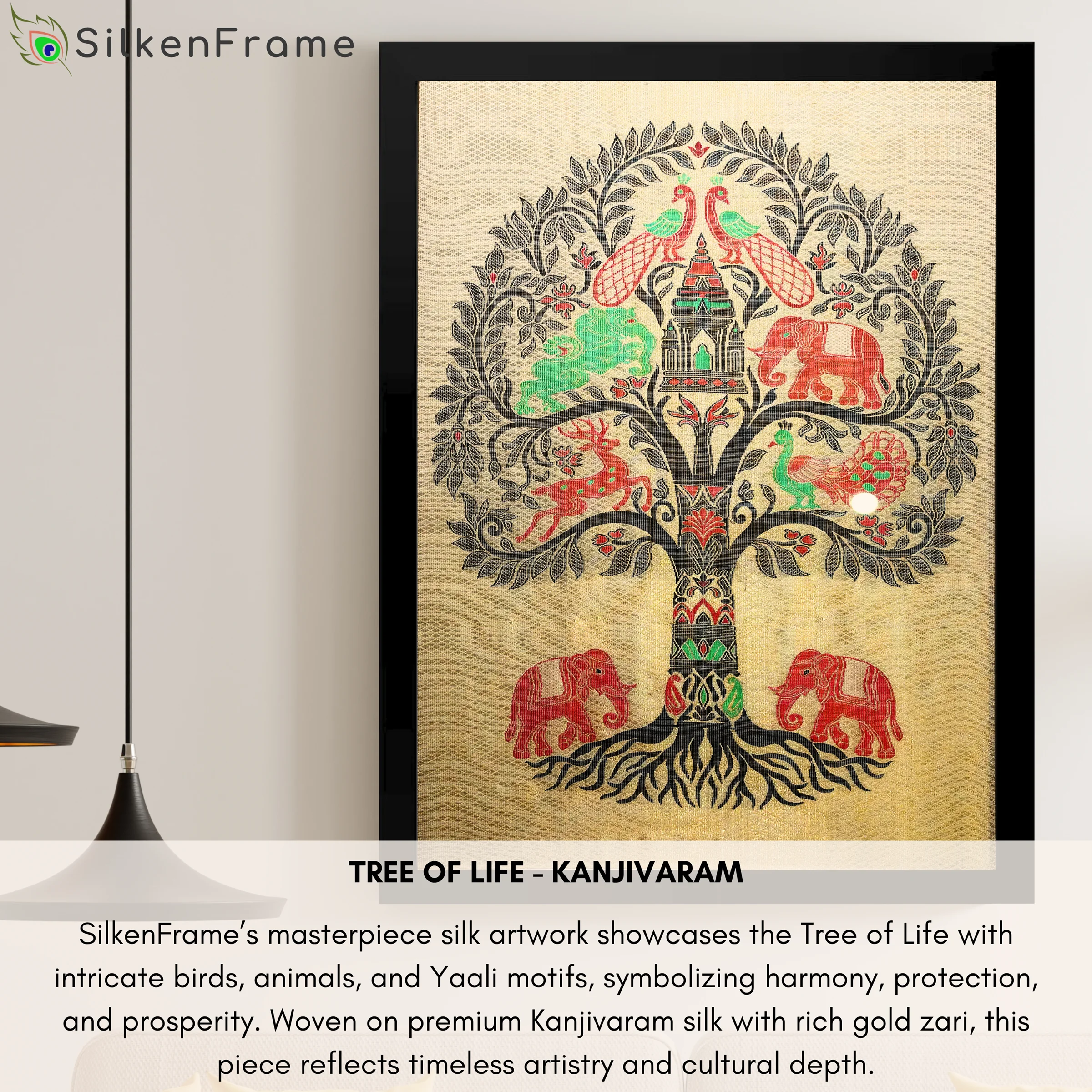 As a Silk Mark Organisation of India member, SilkenFrame guarantees that each artwork is crafted from pure natural silk and carries the official Silk Mark hologram issued by the Central Silk Board, Government of India. All SilkenFrame Artworks are Handloom made in Kanchipuram, Tamil Nadu. Buy Kanjivaram Silk Art – Handcrafted Wall Frame of Tree of Life – Kanjivaram by SilkenFrame SilkenFrame presents Tree of Life – Kanjivaram, a grand handloom-woven Kanjivaram silk artwork that beautifully blends nature, mythology, and traditional storytelling. This masterpiece features a richly detailed Tree of Life, intricately adorned with sacred animals, birds, Yaali motifs, and temple architecture, symbolizing harmony, strength, and divine balance. At the heart of the composition stands a stylized temple structure, surrounded by vibrant motifs of peacocks, parrots, elephants, deer, and the mythical Yaali, which represents protection, power, and guardianship in South Indian temple tradition. The symmetrical design and flowing branches reflect the interconnectedness of life, creating a visual narrative of prosperity, resilience, and spiritual unity. Woven on authentic Kanjivaram silk from Kanchipuram, this artwork is enriched with fine gold zari and a striking palette of red, green, and deep dark brown on a luminous half-white base. The intricate layering of motifs and precision weaving elevate this piece into a true collector’s artwork within SilkenFrame’s Masterpiece Series. Every detail—from the ornate foliage to the symbolic figures—showcases the mastery of skilled artisans, making this artwork not just décor, but a celebration of heritage, mythology, and craftsmanship. Ideal for luxury interiors, statement walls, or heirloom gifting, this silk artwork brings depth, cultural richness, and timeless elegance into your space . Made with: Pure Kanjivaram Silk and Gold Zari Base Color: Half White Design Colors: Gold Zari, Red, Green, and Dark BrownTree of Life – Kanjivaram | Pure Kanjivaram Silk Art | Handloom | Masterpiece Series